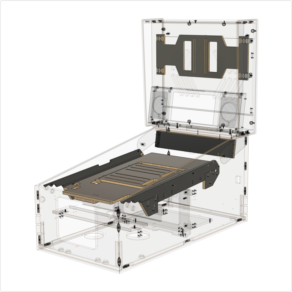 Navrženo pro montáž elektroniky, PC a zařízení simulujících reálný zvukový feedback pinballů. Boční panely kabinetu jsou již předvrtané, což vám umožňuje uspořádat interní komponenty podle vašich preferencí. Pouze otvor pro tlačítko start je vyfrézován na předním panelu kabinetu. Vyfrézované otvory pro další tlačítka se nacházejí pod kabinetem v přední části pro snadný přístup. Toto umístění odpovídá nejnovějším trendům, s cílem dosáhnout čistého a minimalistického designu, který co nejvíce odpovídá vzhledu moderních pinballů. Na spodním panelu kabinetu jsou také vyfrézovány otvory pro 120 mm ventilátor, 6,5" subwoofer a USB port.