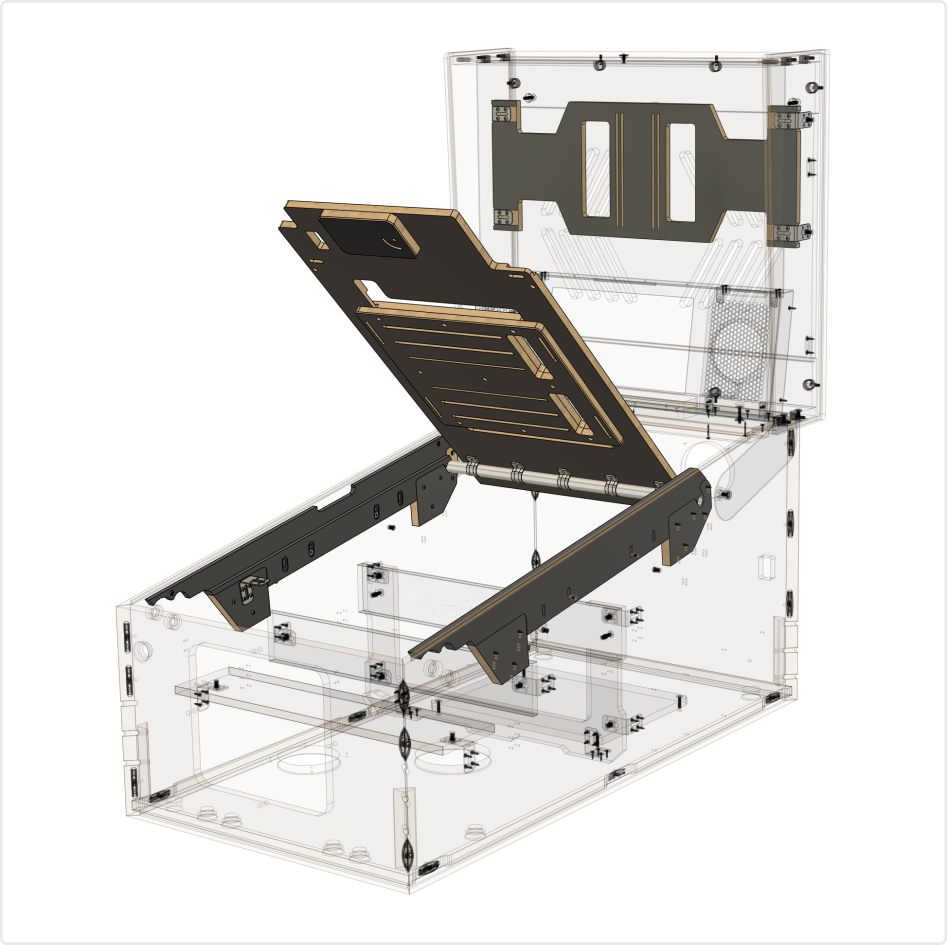 Kabinet je dodáván s držákem herní plochy nastaveným na pozici paralelně k sklu. Pokud se rozhodnete tuto pozici změnit, postupujte podle pokynů v uživatelské příručce. K tomu budete potřebovat pouze šroubovák a imbusový klíč. Imbusový klíč je součástí dodávky.